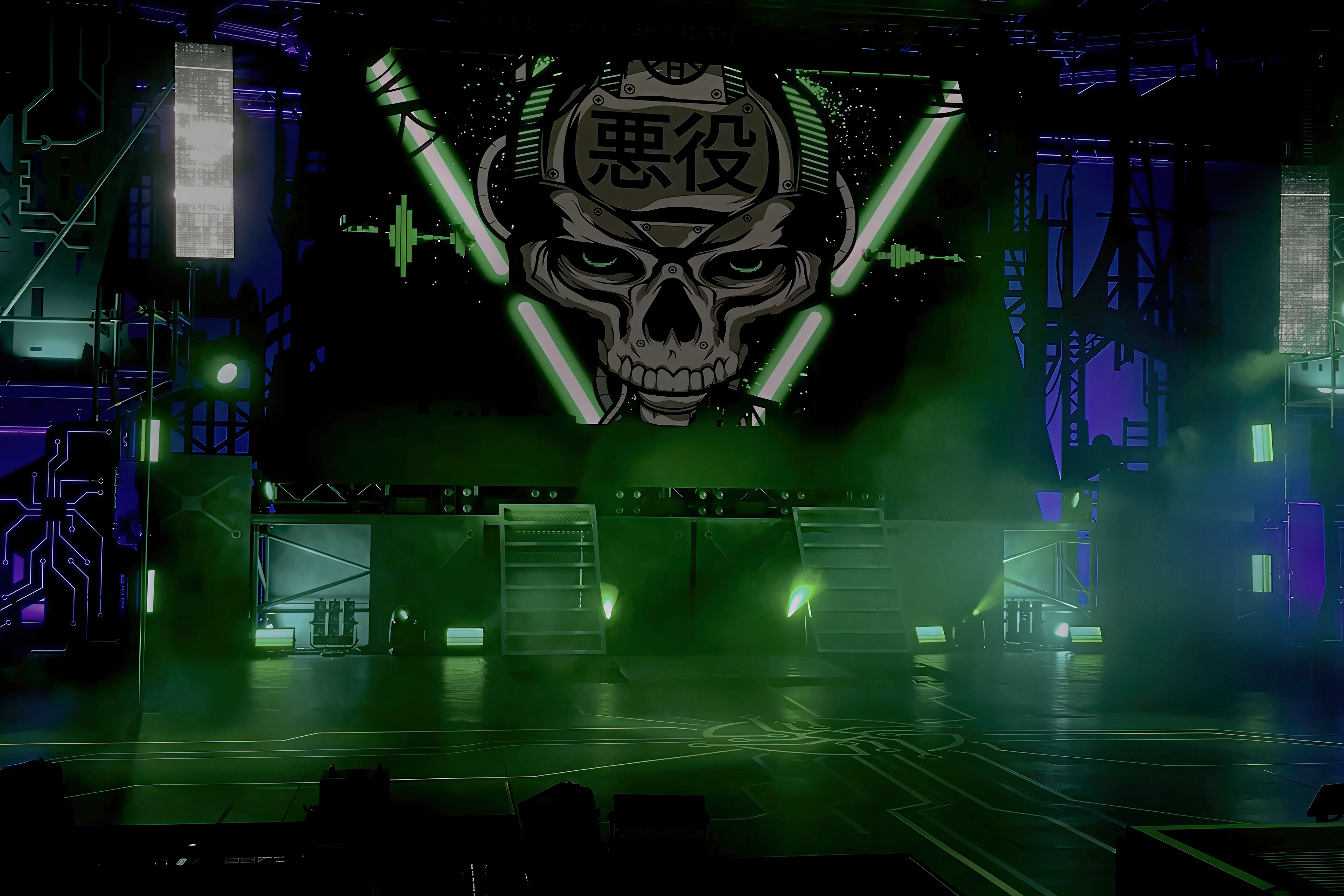 Academy of Villains: House of Fear was one of the two featured shows at Halloween Horror Nights at Universal Studios Orlando. The Regime design was displayed on the video board during their dance performance, graphic showcases a robot skull with the word “Villain” written in Japanese on its forehead.